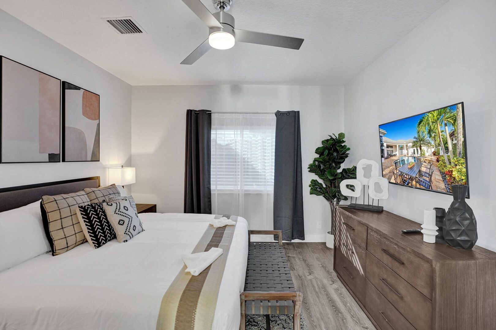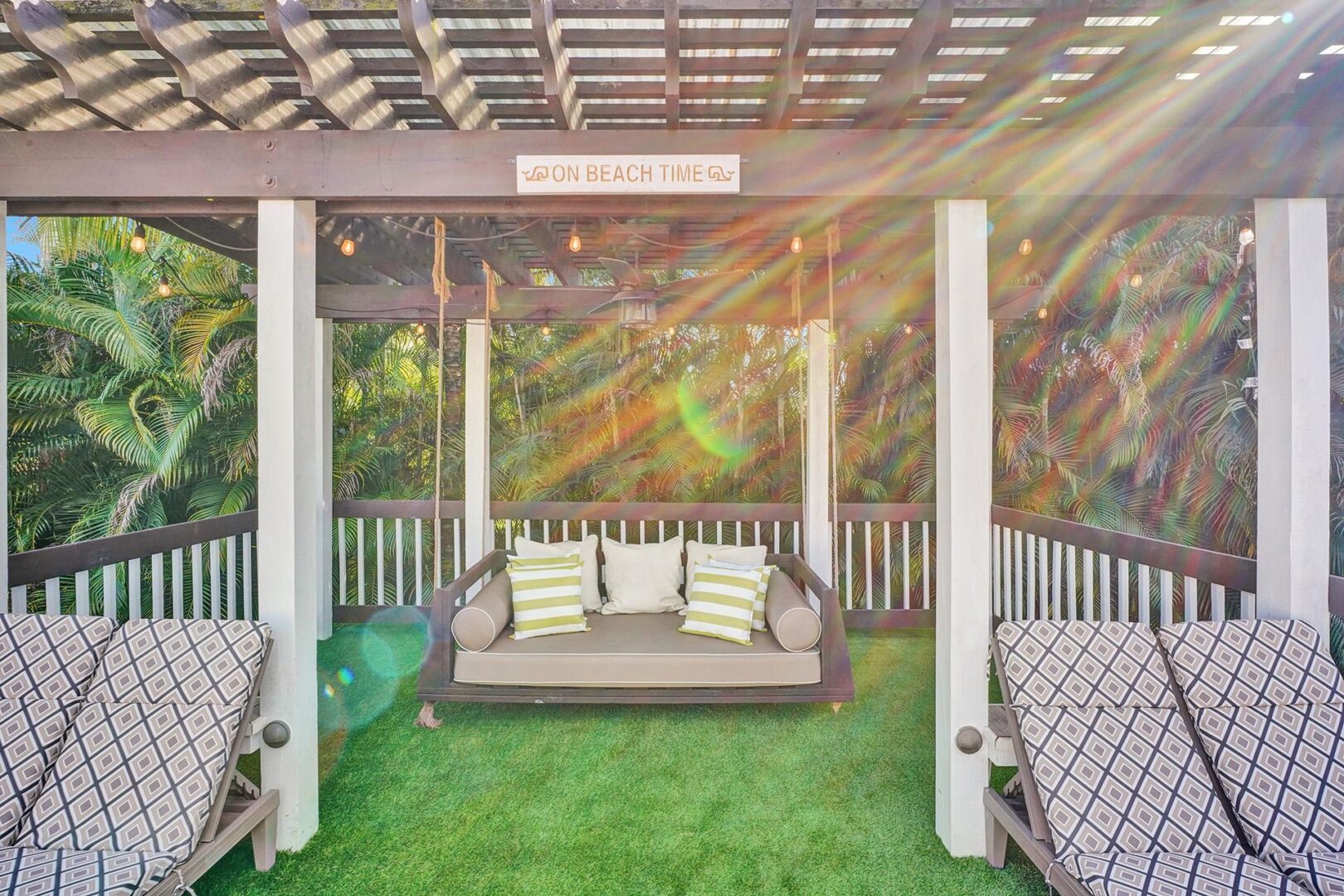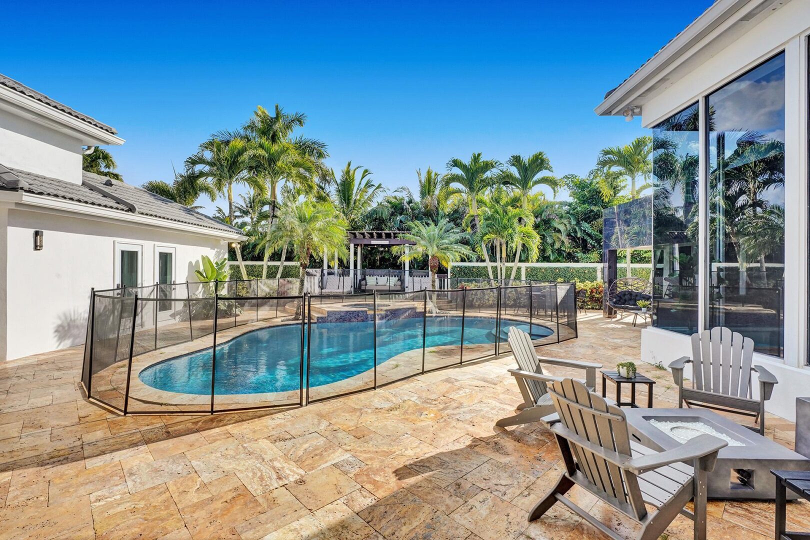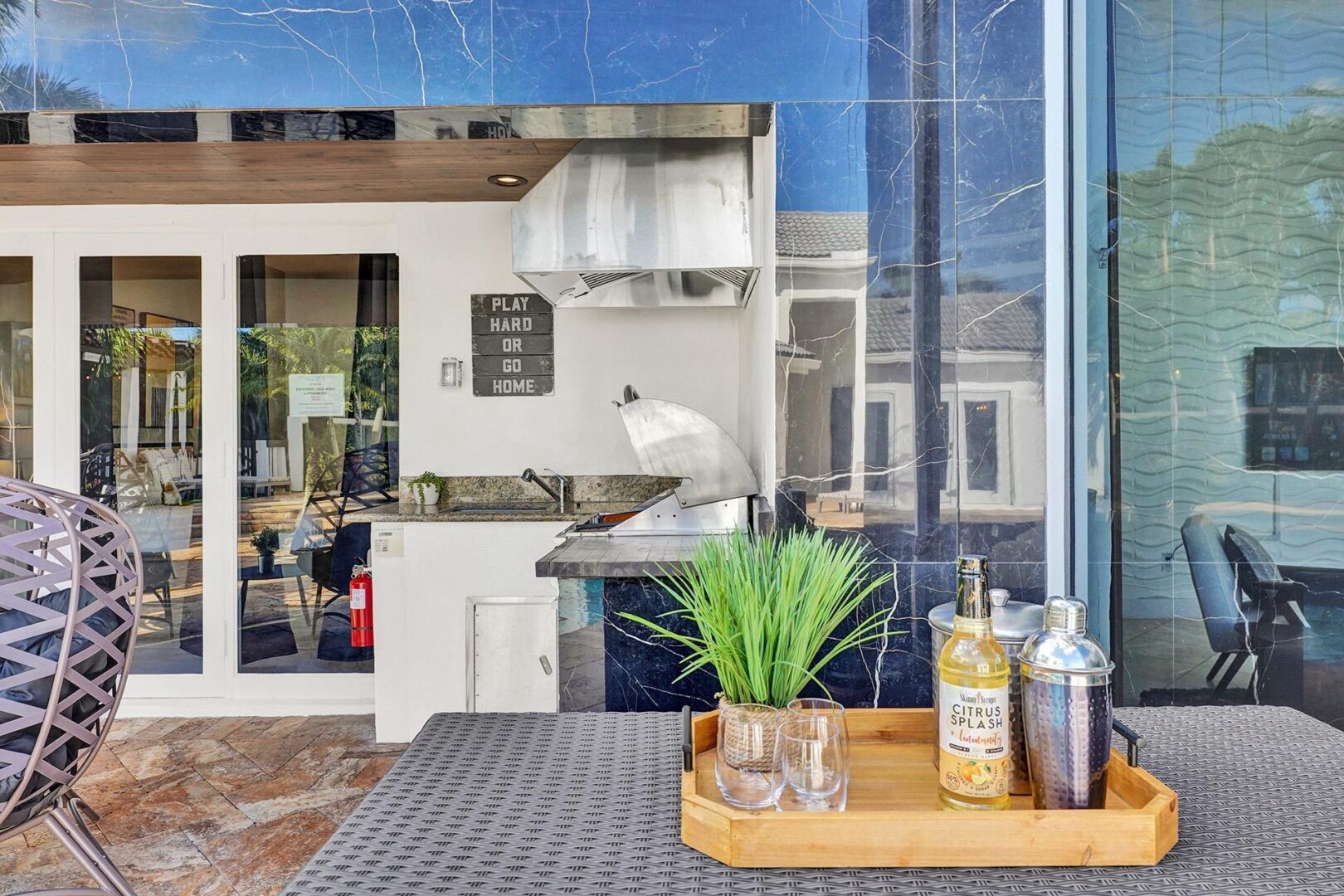 Courtyard: The front door opens to a beautifully designed courtyard featuring a pool, lounge chairs, a large swing sofa, an outdoor dining table that seats 6, a BBQ grill, and multiple seating areas around a cozy firepit.